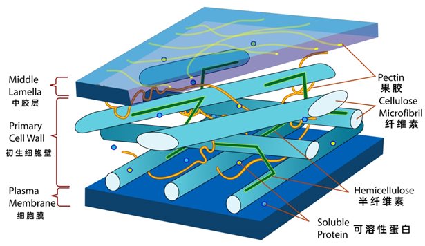 植物細(xì)胞壁是存在于植物細(xì)胞外圍的一層厚壁,是區(qū)別于動(dòng)物細(xì)胞的主要特征之一。細(xì)胞壁是植物的重要組成成分,具有增強(qiáng)植物機(jī)械強(qiáng)度,調(diào)控細(xì)胞生長(zhǎng)速度,涉及植物物質(zhì)運(yùn)輸,抵御病菌危害及逆境影響以及參與細(xì)胞間信息傳遞等功能。