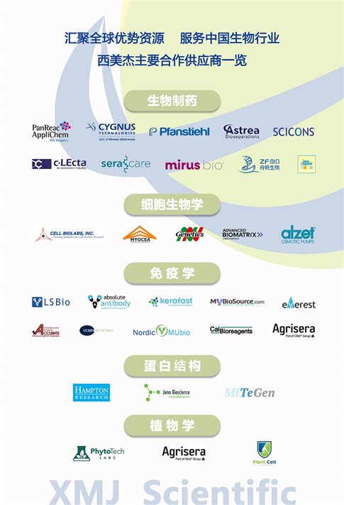 西美杰擁有進(jìn)出口資質(zhì)和自己的國(guó)際物流,與國(guó)內(nèi)外40余家試劑、儀器、原輔料及技術(shù)服務(wù)供應(yīng)商建立了長(zhǎng)期穩(wěn)定的合作關(guān)系,集結(jié)了Applichem、Cygnus、Pfanstiehl、c-LEcta、Mirus、Astrea Bioseparations、KPL、舟帆生物等數(shù)十家國(guó)內(nèi)外知名品牌。