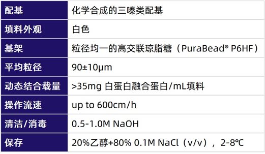 AlbuPure®是Astrea Bioseparations和Albumedix公司合作開發(fā)的白蛋白親和層析填料,填料基架是粒徑均一的高交聯(lián)瓊脂糖,配基是合成的三嗪化合物,具體高流速、高動(dòng)態(tài)結(jié)合載量、強(qiáng)化學(xué)耐受性等特點(diǎn),主要用于白蛋白融合蛋白的純化。AlbuPure®的性能參數(shù)如下表所示。