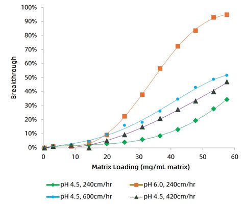 AlbuPure®具有卓越的白蛋白融合蛋白結(jié)合性能,如圖4所示,研究人員在不同pH值不同流速的上樣條件下,探究了AlbuPure®對(duì)scFv-rHSA的動(dòng)態(tài)結(jié)合載量,結(jié)果表明,在pH=4.5,240cm/h線性流速下,AlbuPure®對(duì)目標(biāo)融合蛋白的動(dòng)態(tài)結(jié)合載量最佳,10%流穿時(shí),載量高達(dá)38.4mg/mL。
