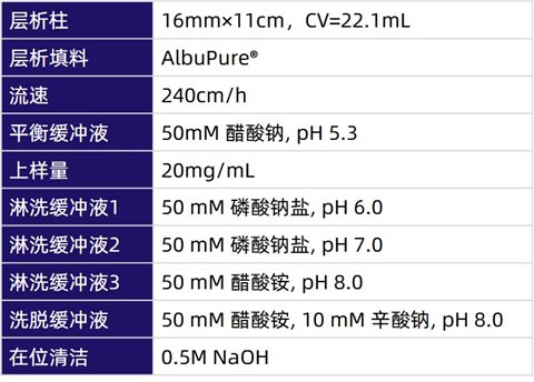 在一項(xiàng)研究測(cè)試中,研究人員使用酵母體系表達(dá)Anti-HIV gp41-rHSA融合蛋白(72kDa),收獲液經(jīng)澄清后,上樣到裝有AlbuPure®的層析柱中,層析工藝參數(shù)如下表所示: