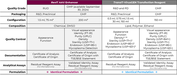 自2023年7月底Mirus上市RevIT? AAV Enhancer以來,RevIT? AAV Enhancer的加入允許不同血清型AAV病毒基因組滴度提高1.2-4.9倍,并且在一定程度提升了實心率,使得AAV生產(chǎn)上游成本進一步降低成為可能,降低了基因治療單劑量成本。由于可輕松靈活的將RevIT整合入現(xiàn)有AAV生產(chǎn)工藝工作流程中,不僅可以搭配Mirus TransIT-VirusGEN® GMP 轉(zhuǎn)染試劑,也適配于其他轉(zhuǎn)染試(如PEI),RevIT? AAV Enhancer得到了國內(nèi)外AAV客戶的廣泛認可及好評,GMP級別試劑也按照計劃如期上市,用于大規(guī)模的AAV GMP生產(chǎn)。