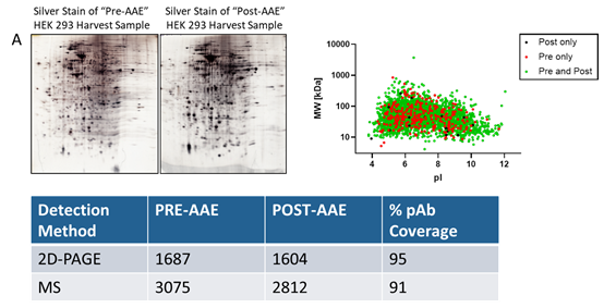 AAE?技術(shù)的優(yōu)勢不僅在于其高靈敏度,更在于其強大的預(yù)測能力和廣泛的應(yīng)用前景。通過AAE-MS?獲得的覆蓋率的結(jié)果更高、更真實,可以更準確地預(yù)測抗HCPs抗體在ELISA中的表現(xiàn)。并且,AAE?與質(zhì)譜聯(lián)用(AAE-MS?)能夠識別收獲材料中與抗體反應(yīng)的HCPs,并獲得蛋白質(zhì)的分子量和等電點(pI)信息,可以評估純化過程中持續(xù)存在的單個HCPs,并優(yōu)化下游純化工藝。