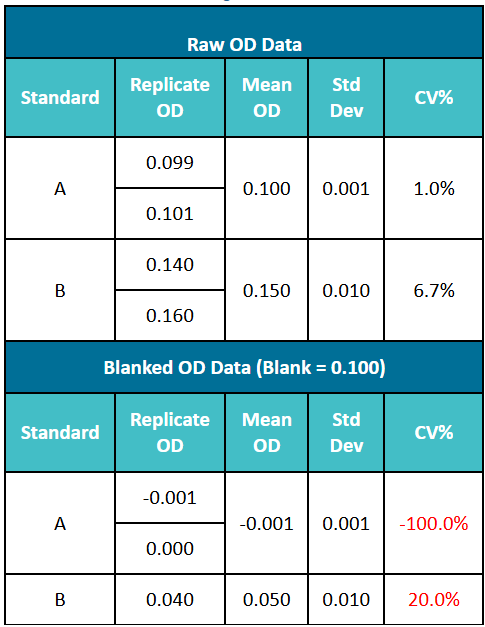 以下示例說明了背景值扣除對變異系數(shù)的影響。在表1中,標準A的平均OD值為0.100,標準B的平均OD值為0.150 。當通過原始讀數(shù)減去空白對照的OD值來計算變異系數(shù)(CV)時,CV值顯著上升,導致標準B的CV%從6.7%增加至20%。