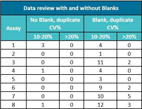 表2. 經過空白對照校正后的CV%與未校正數(shù)據(jù)的CV%值對比