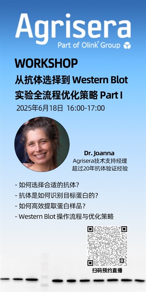 Western Blot實(shí)驗(yàn)效率與結(jié)果的可靠性,很大程度上取決于對(duì)抗體特性的理解、正確的選擇以及實(shí)驗(yàn)流程的優(yōu)化。為解決WB實(shí)驗(yàn)過(guò)程中的常見(jiàn)問(wèn)題,Agrisera技術(shù)專家Joanna博士將為大家?guī)?lái)WB全流程優(yōu)化系列講座,本系列講座包含兩次線上直播課程,6月18日下午4點(diǎn)直播第一次課程:從抗體選擇到WB全流程優(yōu)化策略,深度解析Western Blot技術(shù)的關(guān)鍵環(huán)節(jié),為您提供專業(yè)的優(yōu)化方案,歡迎大家提前報(bào)名預(yù)約。