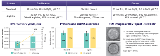 用0.8M精氨酸洗脫,HSV回收率可達(dá)到69%,LentiHERO®載量可達(dá)1.4E+8 IU/ml,同時實現(xiàn)高效的雜質(zhì)去除。
