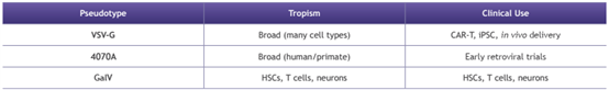 - 4070A: 100%, VSV-G: 82%, GalV: 36%, HSV-1: 69%