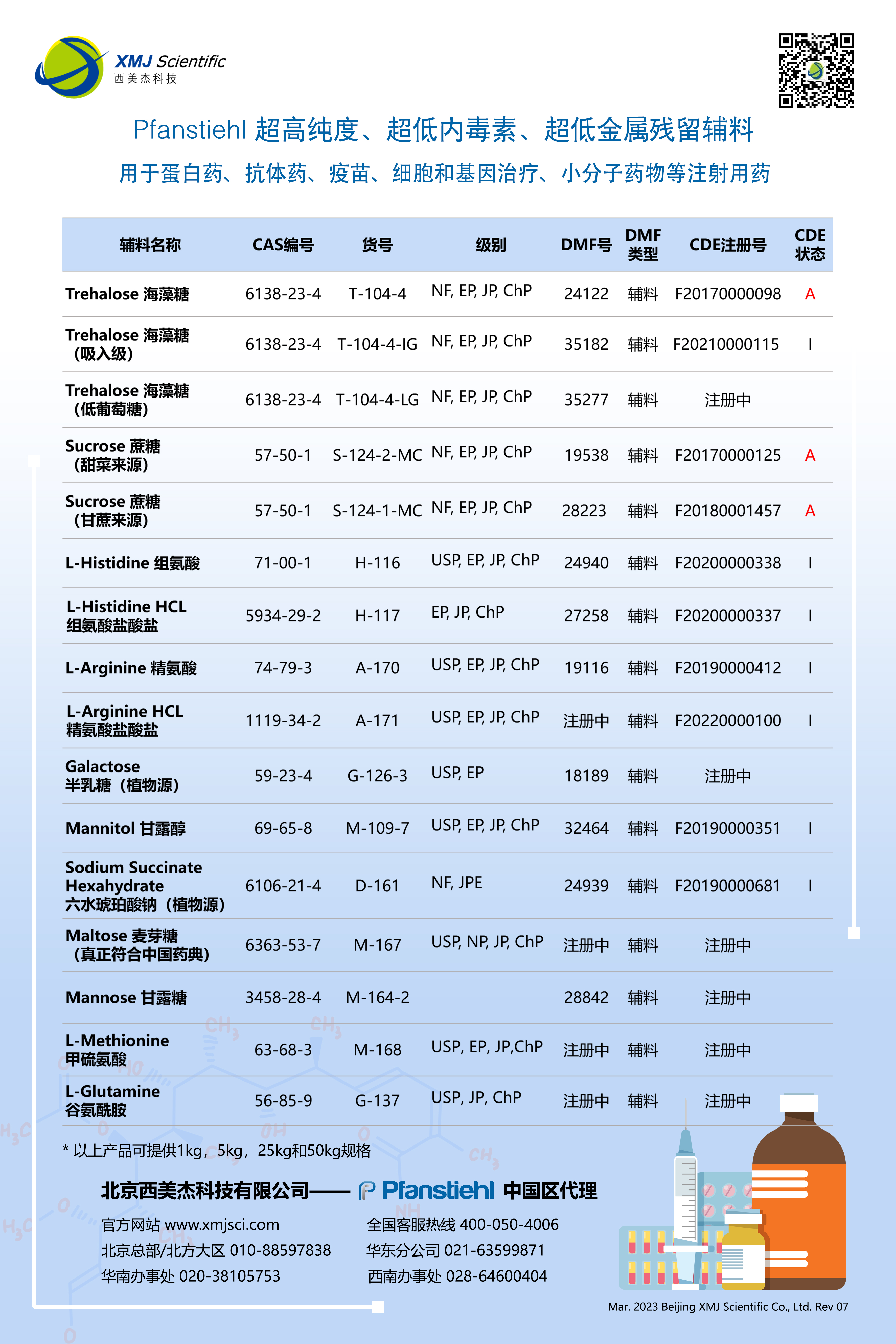 Pfanstiehl致力于為全球生物制劑公司提供高質(zhì)量注射級(jí)藥用輔料,主要產(chǎn)品包括注射級(jí)海藻糖(T-104-4)、蔗糖(S-124-2-MC和S-124-1-MC)、甘露醇(M-109-7)、六水琥珀酸鈉(D-161)、組氨酸(H-116)、組氨酸鹽酸鹽(H-117)、精氨酸(A-170)、精氨酸鹽酸鹽(A-171)等,并已獲得CDE藥用輔料注冊(cè)號(hào),其中海藻糖和蔗糖已經(jīng)處于激活狀態(tài)。