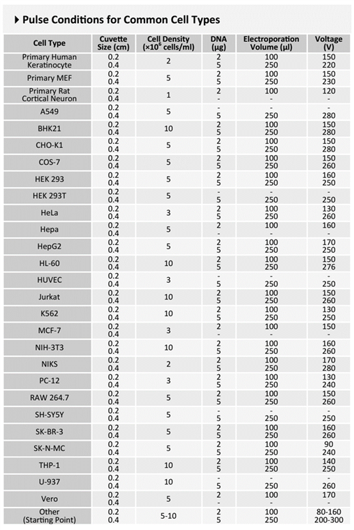 不同細胞電轉(zhuǎn)染參數(shù)推薦