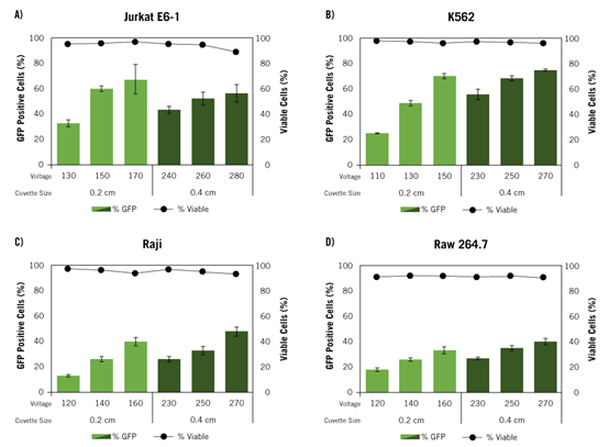 Jurkat E6-1 (A)、K562 (B)、Raji (C)和Raw 264.7 (D)細胞在不同電壓條件下使用Ingenio®電轉(zhuǎn)緩沖液和Ingenio®EZporator®電轉(zhuǎn)儀,分別用0.2cm和0.4cm電轉(zhuǎn)杯和EGFP報告基因觀察電轉(zhuǎn)效率。電穿孔后48h,用流式細胞術(shù)測定GFP陽性細胞百分比(柱狀圖)和細胞活率(點線圖)。