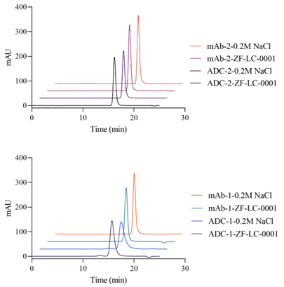 Figure 5. Comparison of SEC Chromatograms Between ZF-LC-0001 and Conventional High-Salt Mobile Phases (Samples: 2 Types of mAbs and 2 Types of ADCs)