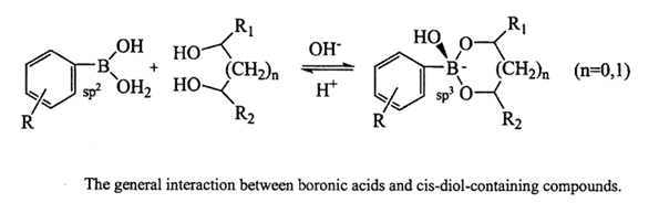 In recent years, boronic acid affinity technology has achieved rapid development in the field of glycoprotein purification, and its unique affinity has attracted great attention from researchers. Boronic acid can undergo a controllable and reversible covalent bonding reaction with cis-diol groups, which are widely present in the glycan structures of glycoproteins. Consequently, boronic acid affinity technology is often used as an effective purification method for the selective enrichment and separation of cis-diol-containing compounds. The working principle of boronic acid affinity interaction is shown in the figure below.