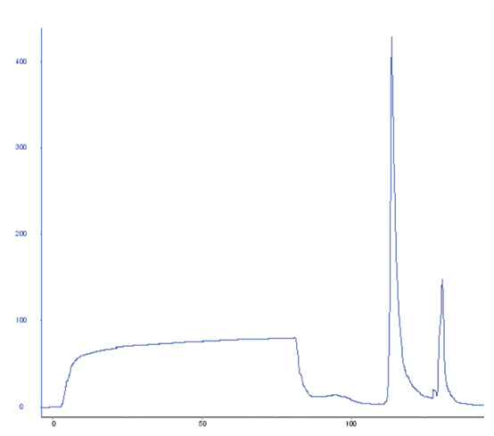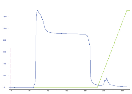APB chromatography resins are particularly suitable for the capture and purification of glycoproteins. The figure below shows a classic affinity purification chromatogram, featuring a large flow-through peak and a small discrete elution peak. Complete recovery of the target glycoprotein is achieved after elution with 50 mM sorbitol.
