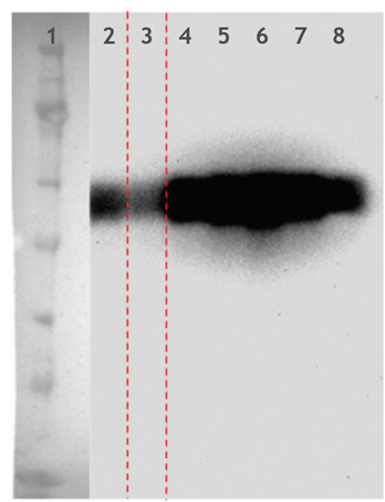 (Lane 1: Molecular Weight Marker; Lane 2: Sample Loaded onto APB A6XL; Lane 3: Flow-Through Fraction; Lanes 4–8: Gradient Elution Fractions)
