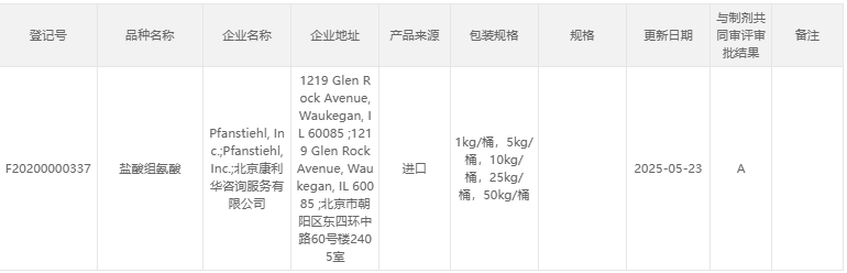 Warm Congratulations! The CDE Registration Number F20200000337 for Pfanstiehl's Injectable-Grade L-Histidine Hydrochloride (H-117) Has Been Activated!
